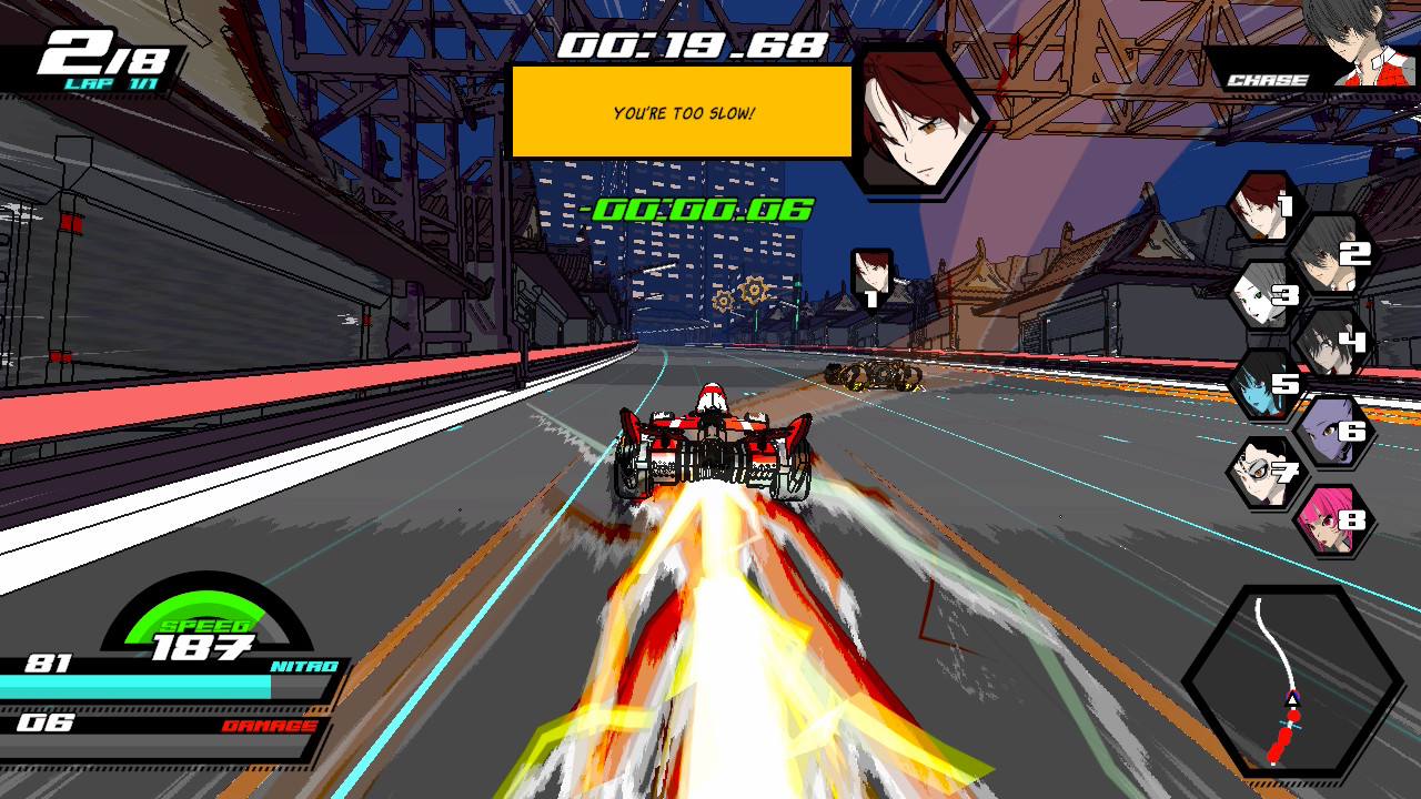 الرسومات: Cel Shading بأسلوب الانمي والسايبربانك، مع التأثيرات الضوئية العالية والتي تعطي أجواء مستقبلية رائعة. ولكن عند السير بسرعة عالية تجعل الرؤية صعبة احياناً مما يجعلها مزعجة.